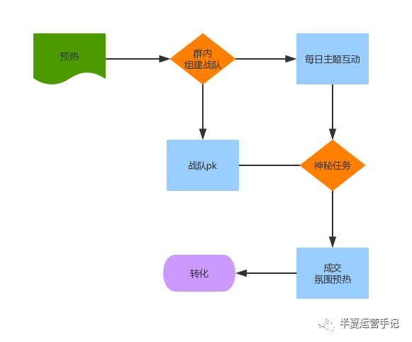 当时我们的快闪活动以群内分小组进行PK的形式进行,重点在于组建战队,进行PK评比,在你追我赶的氛围中完成转化,一场快闪活动我们可以做到35%以上的转化率,10个300人左右的群可成交20万销售额。下图为快闪群活动流程: